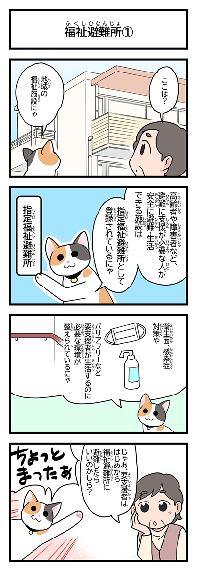 4コマまんがは、いの町在住のまんがプレゼンター みやべゆかさん(池ノ内地区自主防災会長)が優しいタッチで手掛け、主人公の「このみ(女性)」とねこ防災アドバイザーの「キキ(ねこ)」の会話を通して日常の備えや地震・大雨など防災用語をゆるく解説していきます。