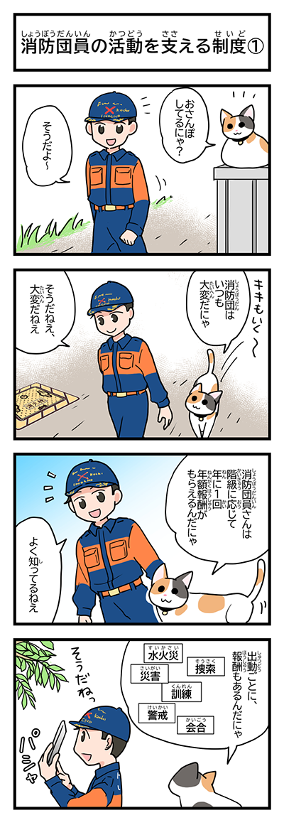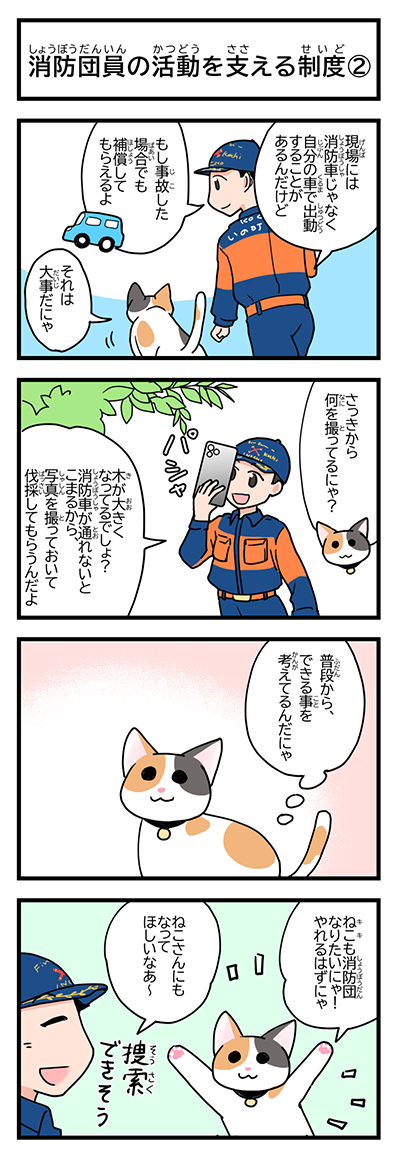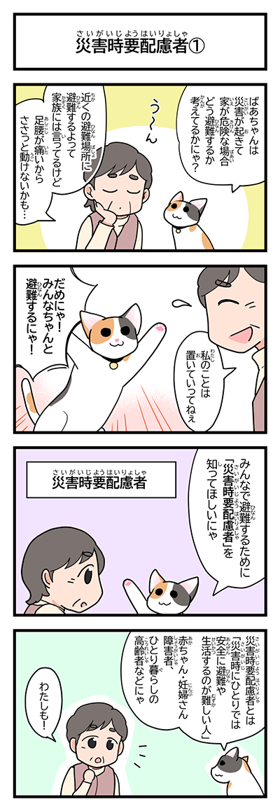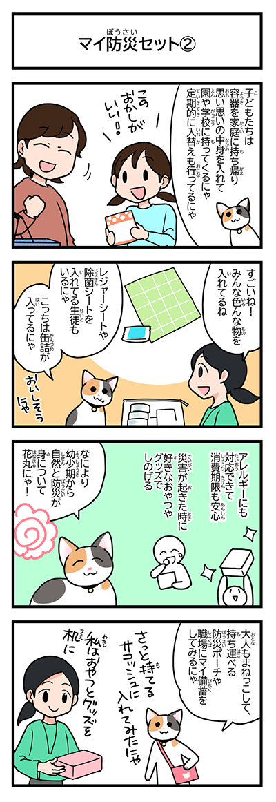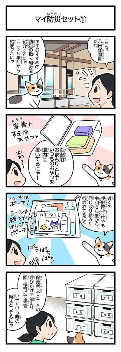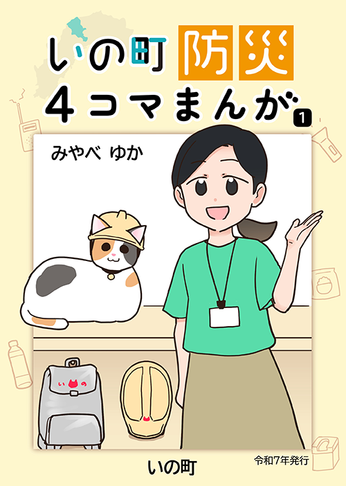 4コマまんがは、いの町在住のまんがプレゼンター みやべゆかさん(池ノ内地区自主防災会長)が優しいタッチで手掛け、主人公の「このみ(女性)」とねこ防災アドバイザーの「キキ(ねこ)」の会話を通して日常の備えや地震・大雨など防災用語をゆるく解説していきます。
