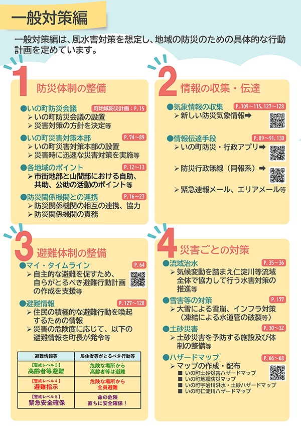 いの町地域防災計画は、災害対策基本法第42条の規定に基づき、いの町の防災に関し、町の処理すべき事務又は業務を中心に、地域内の関係機関の協力を含めた総合的な計画を定めたものです。