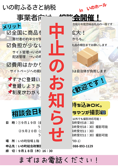【開催中止のお知らせ】いの町ふるさと納税、事業者向け相談会!