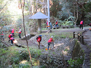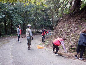 その後、林道に移動し、スコップや竹ぼうきを使って側溝や林道の清掃に汗を流しました。作業後にはきれいになった林道を歩きながら達成感を噛みしめている様子でした。